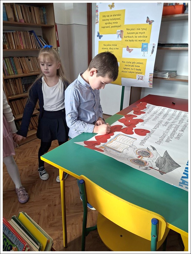 Uczniowie klasy pierwszej już oficjalnie zostali przyjęci do grona czytelników naszej szkolnej biblioteki. Podczas uroczystości nie zabrakło spotkanie z książką, która przypomniała o zasadach dbania o siebie. Uczniowie zmagali się również z zagadkami sprawdzającymi wiedzę czytelniczą oraz złożyli przysięgę przypieczętowaną własnoręcznym podpisem. Na koniec zostali pasowani otrzymując wyprawkę czytelniczą, dyplom i drobny upominek. Życzymy Naszym nowym czytelnikom wielu wspaniałych przygód z książką.