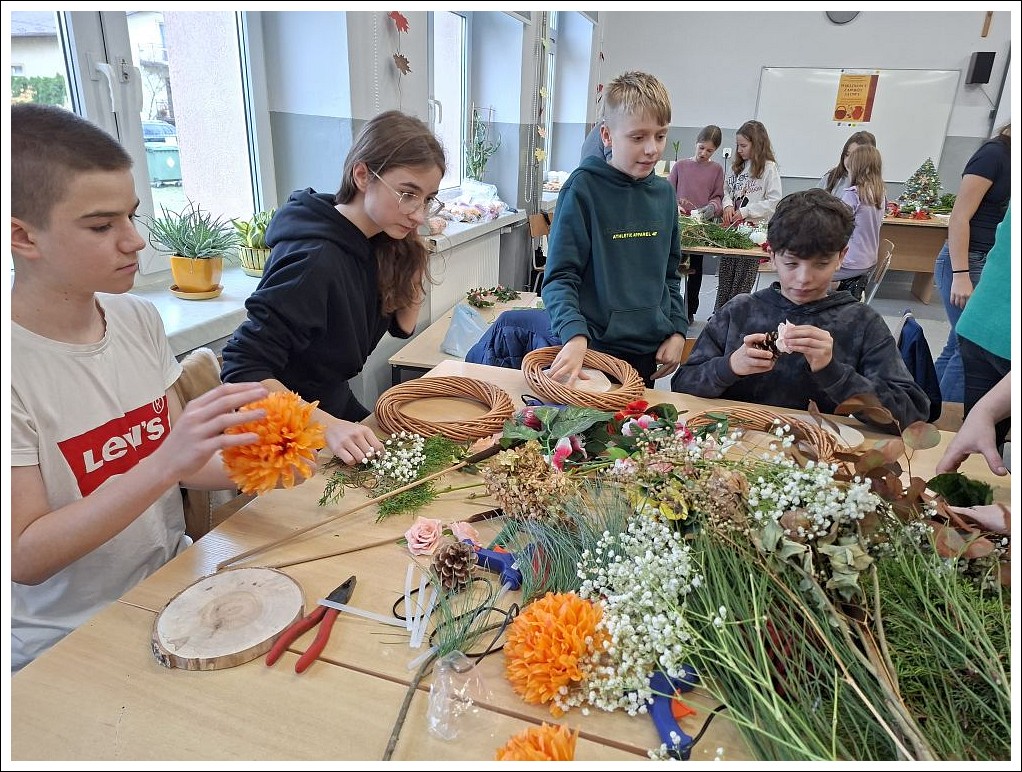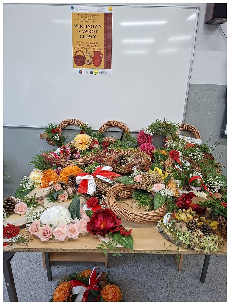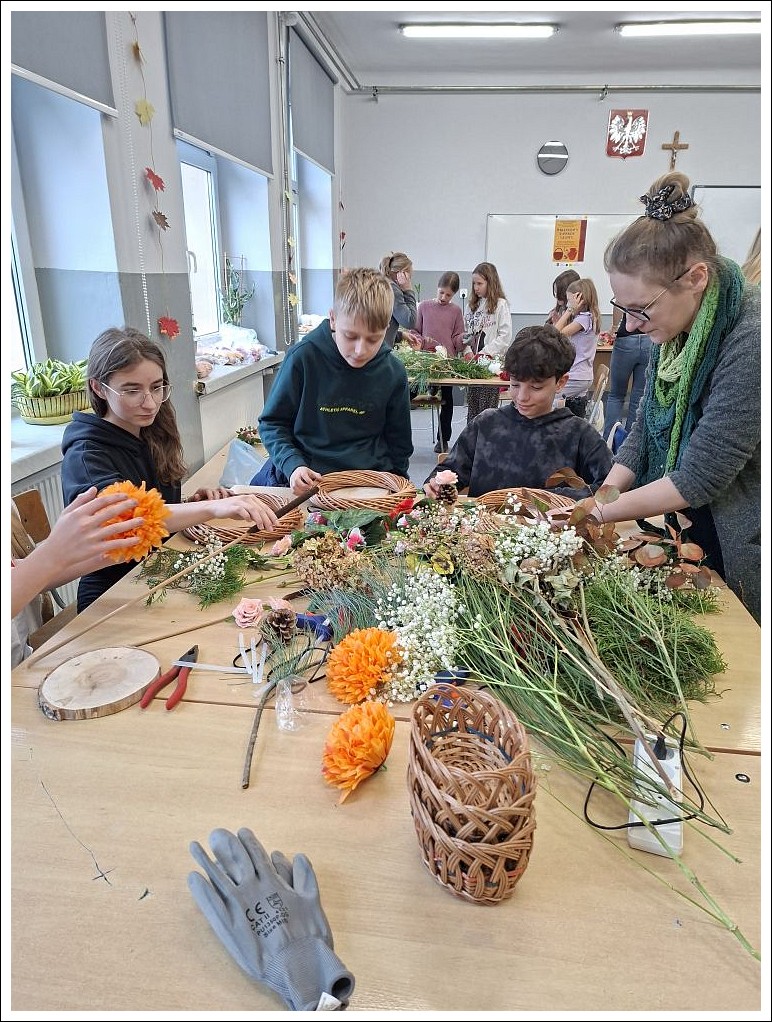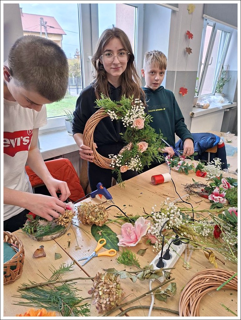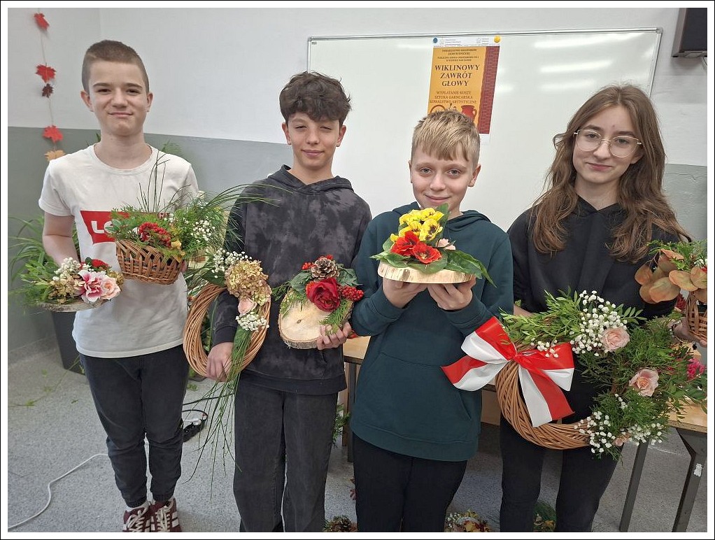 Uczniowie naszej szkoły 28 października 2025 r. wzięli udział w warsztatach organizowanych przez Szkołę Podstawową nr 1 w ramach realizacji projektu „Wiklinowy zawrót głowy”. Zadaniem uczniów było przygotowanie wiklinowych, patriotycznych dekoracji, które 11 listopada mają zostać złożone przez uczniów na mogiłach żołnierskich.